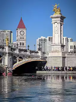 Venture toward Haihe River and the landscape shifts. Wide pedestrian paths hug the waterfront, while the Ferris wheel—the iconic Tianjin Eye—turns slowly above. Locals jog, couples stroll hand in hand, and street performers add charm to the scenic views. The golden hour here is a dream: sunlight bouncing off historic bridges, shimmering on the water’s surface.
