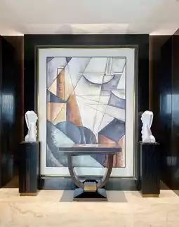 The lobby lounge's elegant and captivating ambiance stems from the hotel's overall Art Deco interior design, masterfully crafted by LTW Designworks, led by Lim Hong Nian. Geometric patterns, graceful lines, artistic decorations, and bright colors are evident throughout the hotel, not just in the lobby lounge. These elements showcase a blend of mechanical and timeless aesthetics, interpreting the beauty of living spaces through classic details.