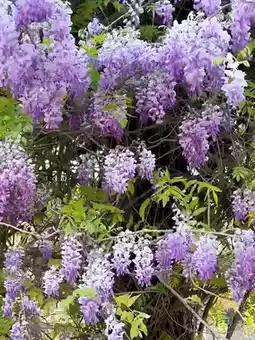 Looking closely, the petals of the wisteria flowers are light purple, like elegant butterflies🦋, lightly perched on the branches. The tips of the petals are slightly darker, becoming lighter towards the base, like a carefully shaded watercolor painting by a painter, with natural and beautiful color transitions. Their four petals are slightly open, surrounding the light yellow stamens, like guarding a precious pearl. A gentle breeze blows, and the wisteria flowers sway gently, as if countless butterflies are dancing in the wind, making a rustling sound, as if telling an ancient and romantic story. The air is filled with the elegant fragrance of wisteria flowers, a fresh and pleasant scent that seeps into your nostrils, like a gentle embrace, dispelling your fatigue and worries one by one, allowing you to indulge in this wonderful atmosphere and fully enjoy the peace and joy of the moment.