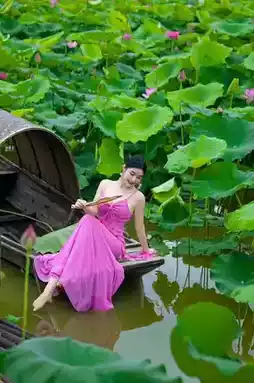 Stand sideways next to the lotus, slightly turn your head, gaze into the distance, with hair fluttering in the wind, creating the mood of "accidentally entering the depths of the lotus flowers," filling the whole scene with a storytelling vibe.