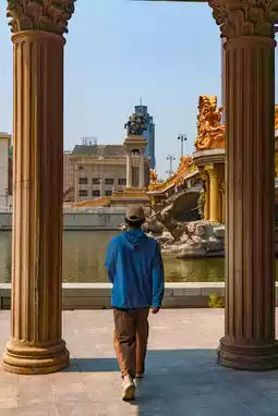 Pretend you’re in Europe! A hidden gem park on the north side of the bridge, with Roman column colonnades + vintage street lamps