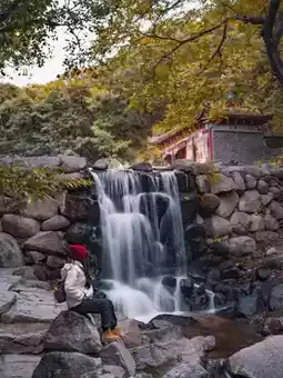 Autumn at Panshan, waterfalls cascading, ancient temples with ginkgo trees, pine forest waves, 🍁mountains covered with maple leaves... directly as beautiful as an ancient painting
