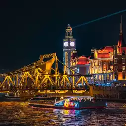 At night, the city illuminated by lights offers a charm distinct from the daytime. Along the walking path, you can enjoy various performances and local delicacies!