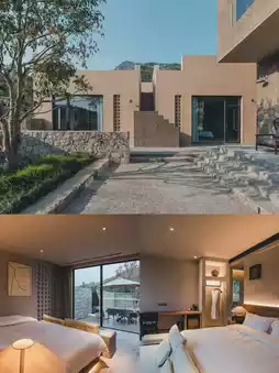 The moment you enter the guesthouse, you’re wrapped in the autumn and winter atmosphere! It’s still that wabi-sabi style courtyard, but the stone walls and wooden beams are draped with caramel-colored vines, sunlight softly filters through the arched windows, falling on rustic pottery and woven rugs. Every snapshot feels like a warm-toned movie scene. On a clear morning, sitting at the room’s doorstep daydreaming, listening to birdsong and watching mist swirl around the mountain’s red leaves, even your breath carries the fresh sweetness of plants—quieter than summer, with an added sense of peace!
