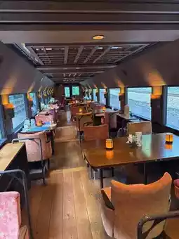 ・Car 2, "Golden no Sho": Group seating with a warm wooden feel.