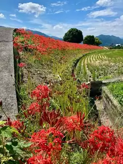 A blanket of crimson red spider lilies blooms along the embankment, creating a landscape often described as a sea of red.