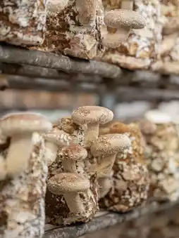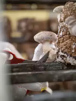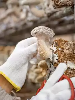 Cut the shiitake you want from the roots of the many mushroom beds lined up✂️