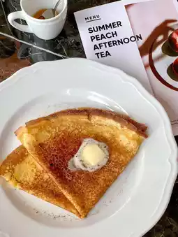 This luxurious afternoon tea includes a three-tier stand lined with a variety of peach sweets and a specialty crepe!
