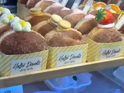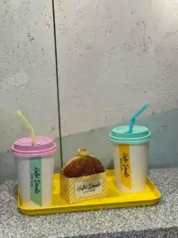The drink cups are particularly eye-catching, with their colorful lids and white cups. Although they are just disposable cups with paper pasted on them, their simple and beautiful design does not feel cheap. The donuts are sandwiched with cream of various flavors, and their beautiful appearance is what makes them so appealing.