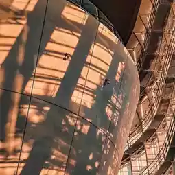 The sun shines on the wavy glass curtain wall and steel frame, lighting up the entire art gallery🤩