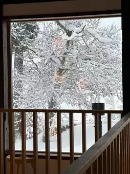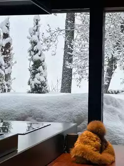 The sauna is a transparent glass room with a beautiful snow view. It's open 24 hours.