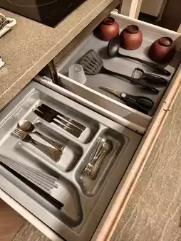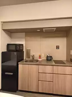There is a small open kitchen in the room. The kitchen is fully equipped. There are refrigerators, ice cube trays, induction cookers, rice cookers, microwave ovens, pots, bowls, plates and cups, etc. Cooking is possible in the room.