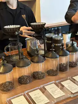 There is a whole row of coffee beans for you to choose from, each carefully selected to showcase the unique flavor of coffee from different places.