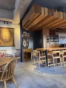 A shop surrounded by stylish interior with a wooden motif where you can enjoy terrace seats and light alcoholic beverages