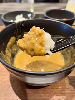 When the remaining soup is diluted with Japanese-style dashi, the rich curry and light dashi blend exquisitely, creating a deep, rich flavor and a light taste. Enjoy a new flavor with every bite, and this is a luxurious way to eat that will leave you satisfied until the very end.