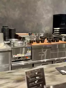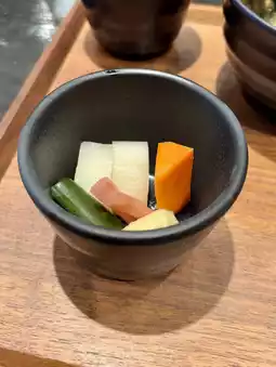The restaurant has only counter seating and indirect lighting, creating a modern, stylish, hideaway-like atmosphere. This is a calming place perfect for soothing you after a long day of travel, allowing you to enjoy a meal in comfort.