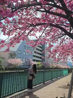 In Tokyo's spring, the Oyokogawa Walkway in Kiba Park becomes an ideal spot for cherry blossom viewing. Every March, the Kawazu cherry blossoms bloom here, with pink petals adorning the riverbanks like clouds, attracting countless visitors. These cherry blossoms are not only vibrant in color but also emit a faint fragrance that captivates the senses.