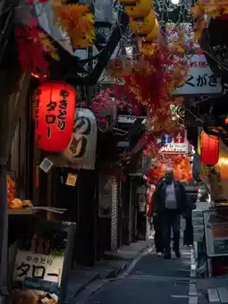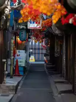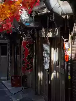 "Shinjuku's Memories Alley is a spot where eateries reminiscent of the Showa era line narrow alleys. In autumn, the soft lighting and the contrast of autumn leaves create a warm ambiance.