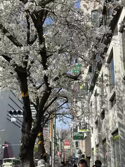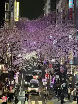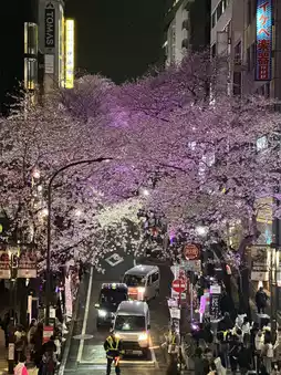 2. **Near Shibuya Stream, Meiji-dori, Sanchome:** The cherry blossoms here are mainly pink, which contrasts sharply with the surrounding modern buildings, giving it a unique urban feel.