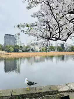 The cherry blossoms around Shinobazu Pond beautifully reflect on the water’s surface.