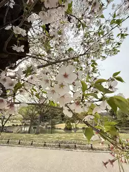 Many cherry trees are planted, and every tree in the park was in full bloom, making it very beautiful 🌸
