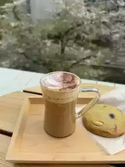 A blend of soy milk and rich espresso, topped with red bean powder inspired by sakura bean paste and cinnamon