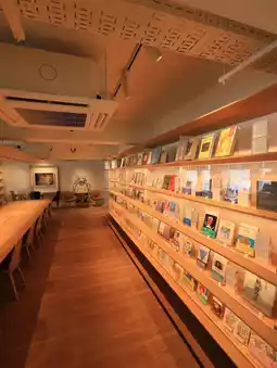 The library is located inside the Waseda University campus, in a quiet environment full of academic atmosphere. As soon as you enter, you see the wooden architecture designed by Japan's master architect Kengo Kuma—simple yet warm. The whole space is filled with natural light, very comfortable. There is also a rotating bookshelf at the entrance, packed with Murakami’s works and translations, and the scent of books is really strong.