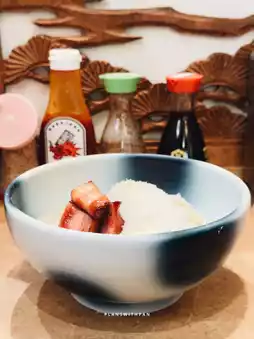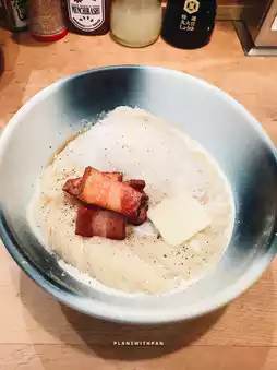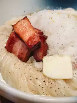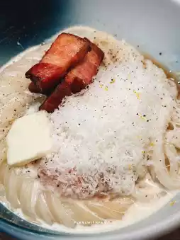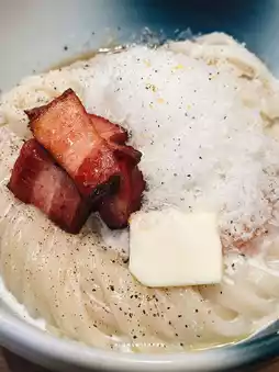This signature dish blends Japanese udon with Western-style carbonara sauce. The chewy udon noodles are mixed with butter, cheese, black pepper, and fresh egg yolk, topped with thick, tender bacon.