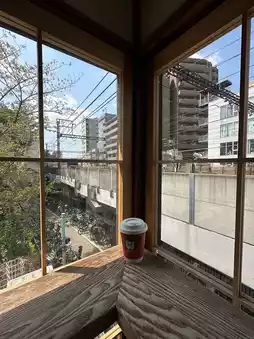 A cozy café located in a quiet alley under the railway near Nakameguro Station in Tokyo. The exterior is full of wooden vibes, and the interior is small but warm.