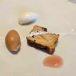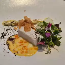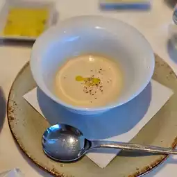 The main dish is roasted pork, and the course includes amuse-bouche, soup, fish appetizer, risotto, dessert, and after-meal drink.