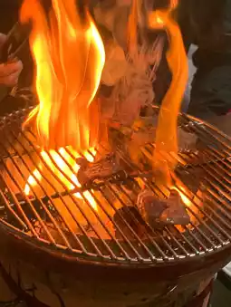 • Charcoal grilling means lots of smoke—ask for ice if the heat gets too intense.
