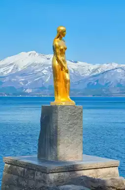 The golden goddess statue by the glassy blue lake, shrouded in morning mist, truly evokes scenes from "The Garden of Words"!