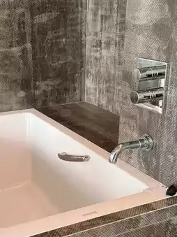 Concrete walls paired with a cypress wood bathtub, soak while enjoying the Skytree view🛁~ Amenities use natural scents from “AUX PARADIS,” leaving you feeling luxurious🧴~ The mirror has hidden LED strips, no need to use your phone light for makeup💄~