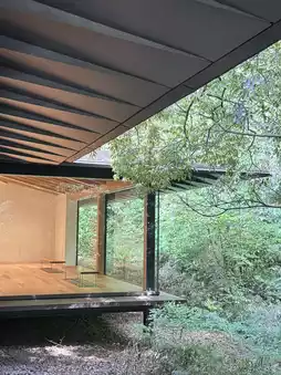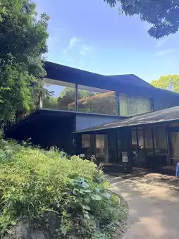 The exterior is a refined architecture (designed by Kengo Kuma)