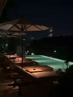 The pool is suspended on the building’s top floor, with glass railings framing the greenery of Yoyogi Park as the backdrop. The water reflects the blue sky and white clouds. Just leaning by the pool for a side shot, the shadows of palm trees and lounge chairs instantly create a tropical vacation atmosphere. The best part is the temperature control design—soaking in the water in December doesn’t feel cold. In the evening, you can watch the sunset while sipping a special cocktail. The tipsy feeling combined with the city skyline is simply the most luxurious relaxation moment for urbanites~
