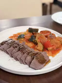 The beef is tender with a good bite, and the seasoning is just right, preserving the natural aroma of the ingredients. The ratatouille has a rich tomato flavor, making it quite appetizing.