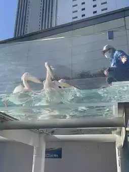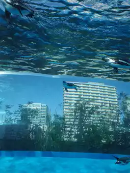 The penguins swimming against the sky in a huge tank on the rooftop of a building are breathtaking.