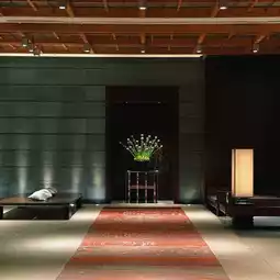 The drop-off area is simple and restrained, not deliberately pursuing luxury. Entering the lobby, a giant fan-shaped installation intertwined with cherry blossom imagery forms the visual focus🌸. The space is laid out symmetrically along a central axis, with a high ceiling design creating a sense of order. The lobby doesn’t show off but settles emotions under the theme of "wood as the source of water."