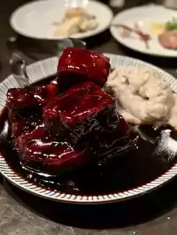 The aged pork black vinegar sweet and sour pork features a deep flavor enhanced by a secret sauce, making it a memorable dish.
