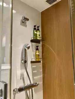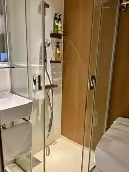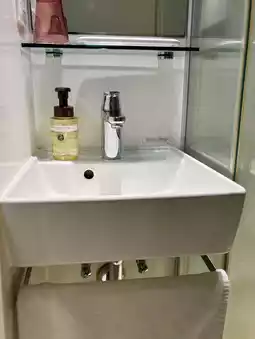 The bathroom features a shower booth only, with no bathtub, but it is clean and user-friendly.