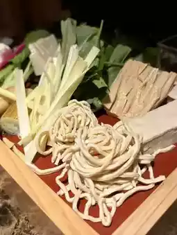 Then, meat was served! Three kinds: chicken, pork, and beef. After shabu-shabu, I was already full and very satisfied, but then mushroom noodles came out as the finale. They absorbed the soup and were so delicious that, even though I was full, I could still eat them—it's a mystery (lol).