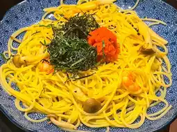- Mentaiko Carbonara Pasta with Yuba and Mozzarella Cheese (1,200 Yen)