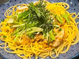 - Mentaiko Pasta with Shrimp and Shimeji Mushrooms (1,100 Yen)