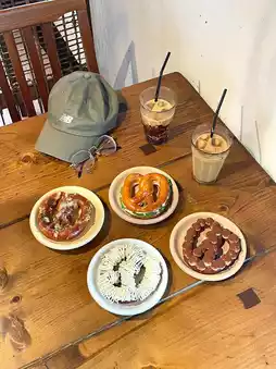 I also tried the "Cheese Onion" and "Cinnamon Sugar" flavors. The former is savory and stringy, while the latter is coated with cinnamon sugar frosting. The dough is chewier than regular bakery bread~ The size is about one palm smaller, perfect for girls to eat one, two will fill you up~ The window seats on the second floor are perfect for photos, with sunlight pouring onto the wooden tables and Korean BGM playing, you instantly feel like you're in Hongdae!