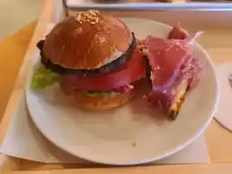 The savory items in this afternoon tea include a brioche handmade burger and a scone topped with prosciutto and dried tomatoes, both of which have a delightful sweetness as if honey were added.
