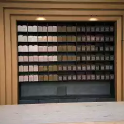 The façade is minimalist and unfussy, with a stark black finish and golden cube motifs. Inside, warm mortared floors and walls frame rows of packaged beans. You can stand at the small counter to sip espresso or filter brew, but there’s no seating—this is meant for bean exploration and mindful tasting.()