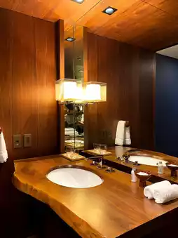 The rooms are spacious with calming wood-grain interiors. The bathroom is beautifully designed, and I was soothed by the deep bathtub🛁