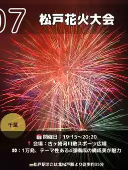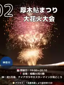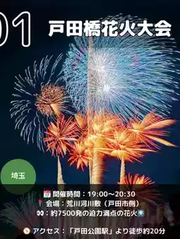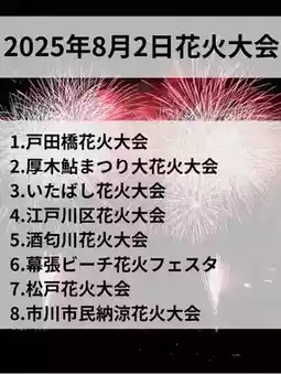 Carefully selected by a former travel employee! Sharing travel information that offers great value and lets Gen Z office workers fully enjoy local experiences! I’ll post recommended spots and useful travel tips unique to a former travel employee, so follow me to get the latest updates😄 @Kawatabi✈️Kanto Outings🧳 ---------------------------------------------------- Details of the posts are below👇 Which one are you interested in? Let me know in the comments~🙏 1. Todabashi Fireworks Festival (Saitama, Itabashi) 📅 7:00 PM – 8:30 PM 📍 Arakawa Riverside (Toda City side) 🎆 About 7,500 fireworks / Synchronized show with Itabashi! 🧭 About 20 minutes on foot from JR Saikyo Line "Toda Koen Station" 💰 Mostly free / Paid seats available 2. Atsugi Ayu Festival Grand Fireworks (Kanagawa) 📅 7:00 PM – 8:10 PM 📍 Sagami River Riverside (near Atsugi Central Park) 🎆 About 10,000 fireworks, Niagara Falls & star mines are spectacular! 🧭 About 15 minutes on foot from Hon-Atsugi Station 💰 Free / Paid seats available 3. Sakawa River Fireworks Festival (Kanagawa, Odawara) 📅 7:10 PM – 8:00 PM (Ceremony from 6:30 PM) 📍 Sakawa River Sports Plaza (around Kamonomiya Station) 🎆 About 10,000 fireworks / Fusion of Niagara Falls, drums & music! 🧭 About 15 minutes on foot from Kamonomiya Station 💰 Free / Paid seats available 4. Itabashi Fireworks Festival (Itabashi Ward, Tokyo) 📅 7:00 PM – 8:30 PM 📍 Arakawa Riverside (Itabashi Ward side) 🎆 About 15,000 fireworks / Double the impact with Todabashi competition! 🧭 About 20 minutes on foot from Ukima-Funado Station 💰 Free / Paid seats available 5. Edogawa Ward Fireworks Festival (Edogawa Ward, Tokyo) 📅 7:15 PM – 8:20 PM 📍 Edogawa Riverside (past Tokyo Metropolitan Shinozaki Park) 🎆 50th anniversary / Fuji-shaped fireworks and special performances! 🧭 About 25 minutes on foot from Koiwa Station 💰 Free / Paid seats available (from about 2,000 yen) 6. Makuhari Beach Fireworks Festa (Chiba City) 📅 7:30 PM – 8:30 PM 📍 Makuhari Seaside Park & Makuhari Messe Parking Lot 🎆 About 20,000 fireworks / Music-synced & sea fireworks are super luxurious! 🧭 About 15–20 minutes on foot from Kaihin-Makuhari Station 💰 Partly free / Paid seats available (advance application required) 7. Matsudo Fireworks Festival (Matsudo City, Chiba) 📅 7:15 PM – 8:20 PM 📍 Furugasaki Riverside Sports Plaza (along Edogawa River) 🎆 About 10,000 fireworks / Beautifully composed in 4 parts with themes 🧭 About 35 minutes on foot from Matsudo Station or Kita-Matsudo Station 💰 Free / Paid seats available (from 3,000 yen) 8. Ichikawa City Summer Fireworks Festival (Ichikawa City, Chiba) 📅 7:15 PM – 8:20 PM 📍 Edogawa Riverside (near Ozumi 3-chome / Gyotoku venue available) 🎆 Held on the same day as Edogawa Ward! Gourmet stalls & plenty of viewing seats 🧭 About 15 minutes on foot from Ichikawa Station / About 20 minutes from Myoden Station 💰 Free / Paid seats available All these fireworks festivals tend to get crowded and have traffic restrictions as the event date approaches, so we recommend planning and traveling early🎇 Have a fun summer night! Access and detailed information are based on official sites and Google Maps of each venue, but please check the latest info on the official sites before visiting. If you like this, please like♡ and save it! ---------------------------------------------------- Introducing recommended sightseeing spots and hotels✌️ Also posting useful travel tips, so please check them out✈️ If you find this helpful and want to support me, following me would be encouraging😆 \Travel that becomes the starting point of your life./ ---------------------------------------------------- Festival Festival Date Festival Summary [Photo sources] - Saitama Newspaper - Itabashi Fireworks Festival Official Site - Edogawa Ward Official Site - Odawara City Official Site - Chiba City Tourism Guide Makuhari & Ichikawa City Summer Fireworks Festival Official Site