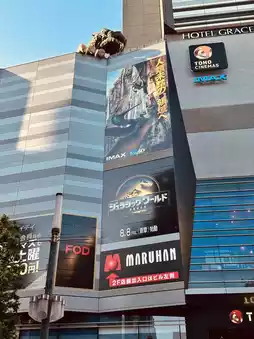 The Shinjuku Godzilla Head is a popular landmark in Shinjuku's Kabukicho district, Tokyo. Located on the eighth-floor terrace of the Hotel Gracery Shinjuku, it towers approximately 12 meters tall, creating a striking illusion from the street, evoking the impression of a giant beast peering down upon the city. The head, erected by Toho Productions, pays homage to classic kaiju films. Every day at noon, afternoon, and evening, Godzilla recreates his roar with lights, sounds, and smoke effects, inviting visitors to take photos. Hotel guests can even "come face to face" with Godzilla from select rooms. Shinjuku Godzilla Head is not only a pilgrimage site for movie fans, but also a fascinating urban spectacle on the streets of Tokyo.