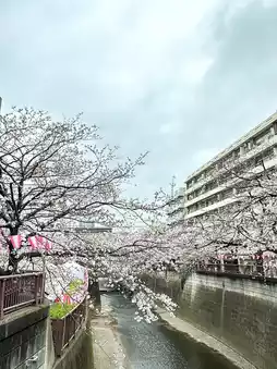 📍Meguro River, where the cherry blossoms hanging over the river look even more stunning